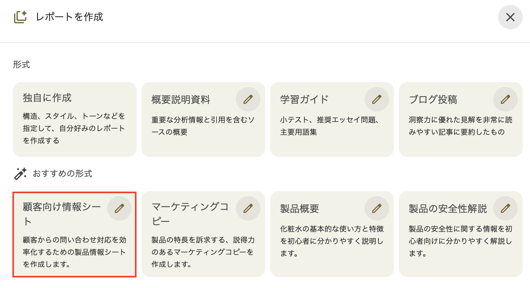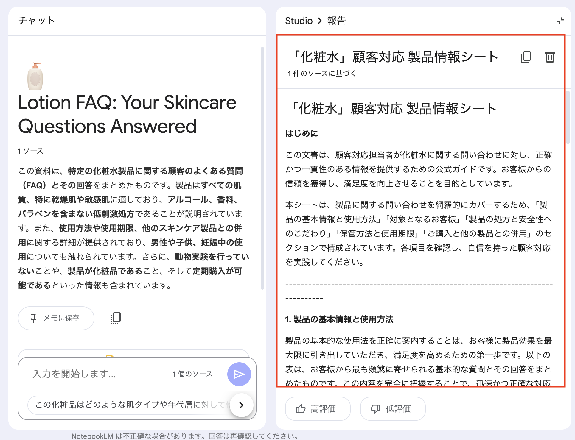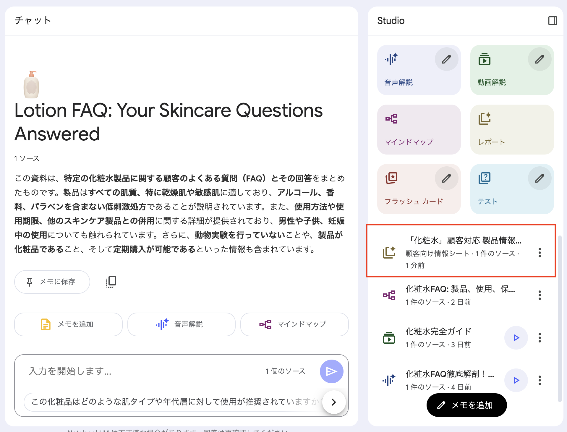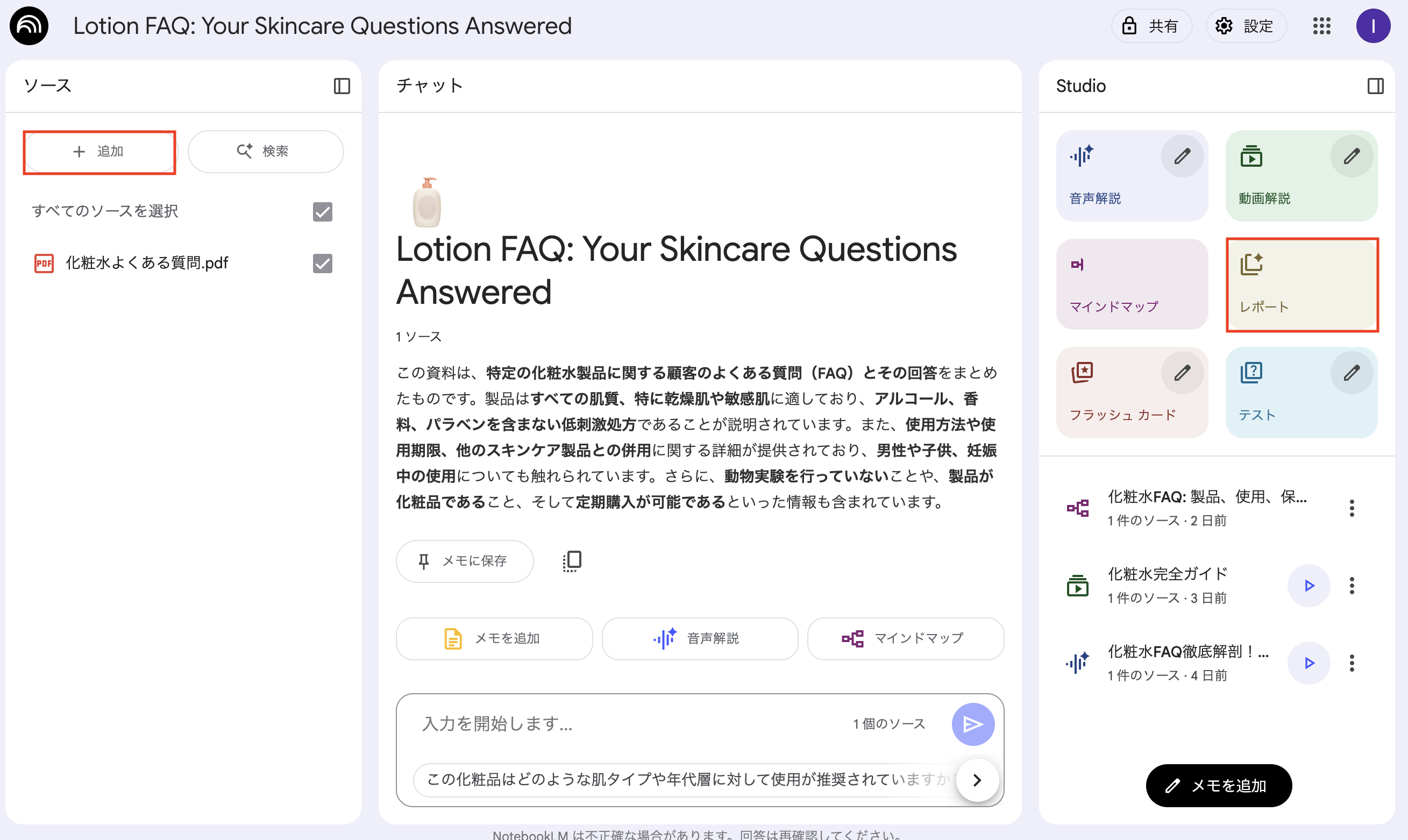 選んだ形式に基づき、NotebookLMがレポートを生成します。Studioの一覧に「レポート」が追加され、すぐに確認できるようになります。ここでは「化粧水 顧客向け情報シート」として保存されています。