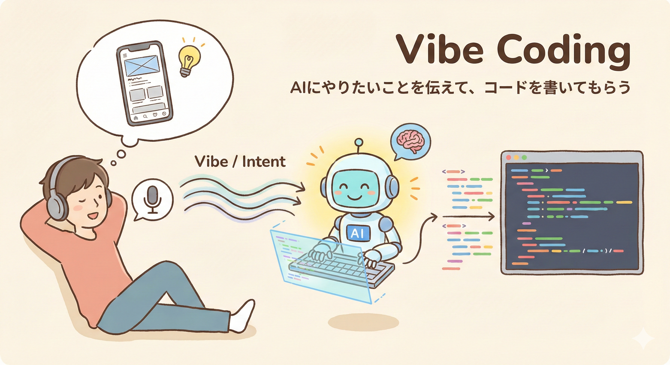 これは簡単に言うと、「AIにやりたいことを伝えて、コードを書いてもらう」 という新しい開発スタイルのことです。