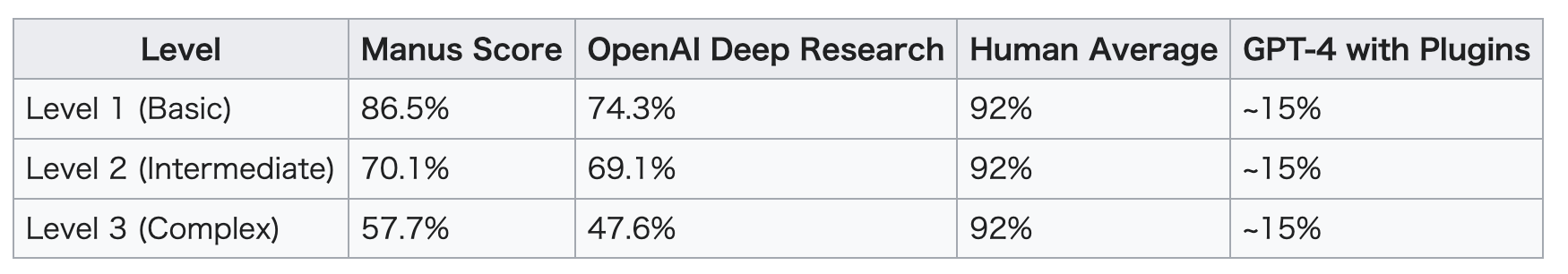 AIエージェントの能力を測る指標に「GAIA(General AI Assistants)」という非常に難易度の高いテストがあります。Manusはこのテストにおいて、これまでの既存AIを大きく引き離す圧倒的なスコアを叩き出しました。