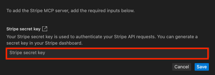設定画面がポップアップします。「Stripe secret key」という入力欄に、Stripeのダッシュボードから取得したご自身のシークレットキー(Secret key)を入力し、右下の「Save」ボタンをクリックして保存します。