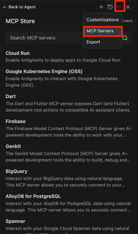 画面右上にある「…(三点リーダー)」メニューをクリックし、ドロップダウンメニューから「MCP Servers」を選択します。これでMCPストアが開きます。