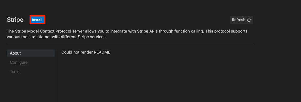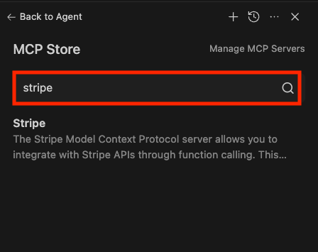 MCP Storeの検索バーが表示されたら、「stripe」と入力します。検索結果にStripeの拡張機能が表示されます。