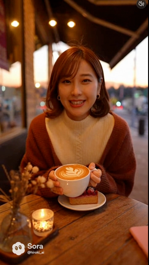 プロンプトの例: 「夕暮れのカフェで、女性がカメラに向かって微笑んでいる。 dialogue: "今日も一日、お疲れ様でした"」
