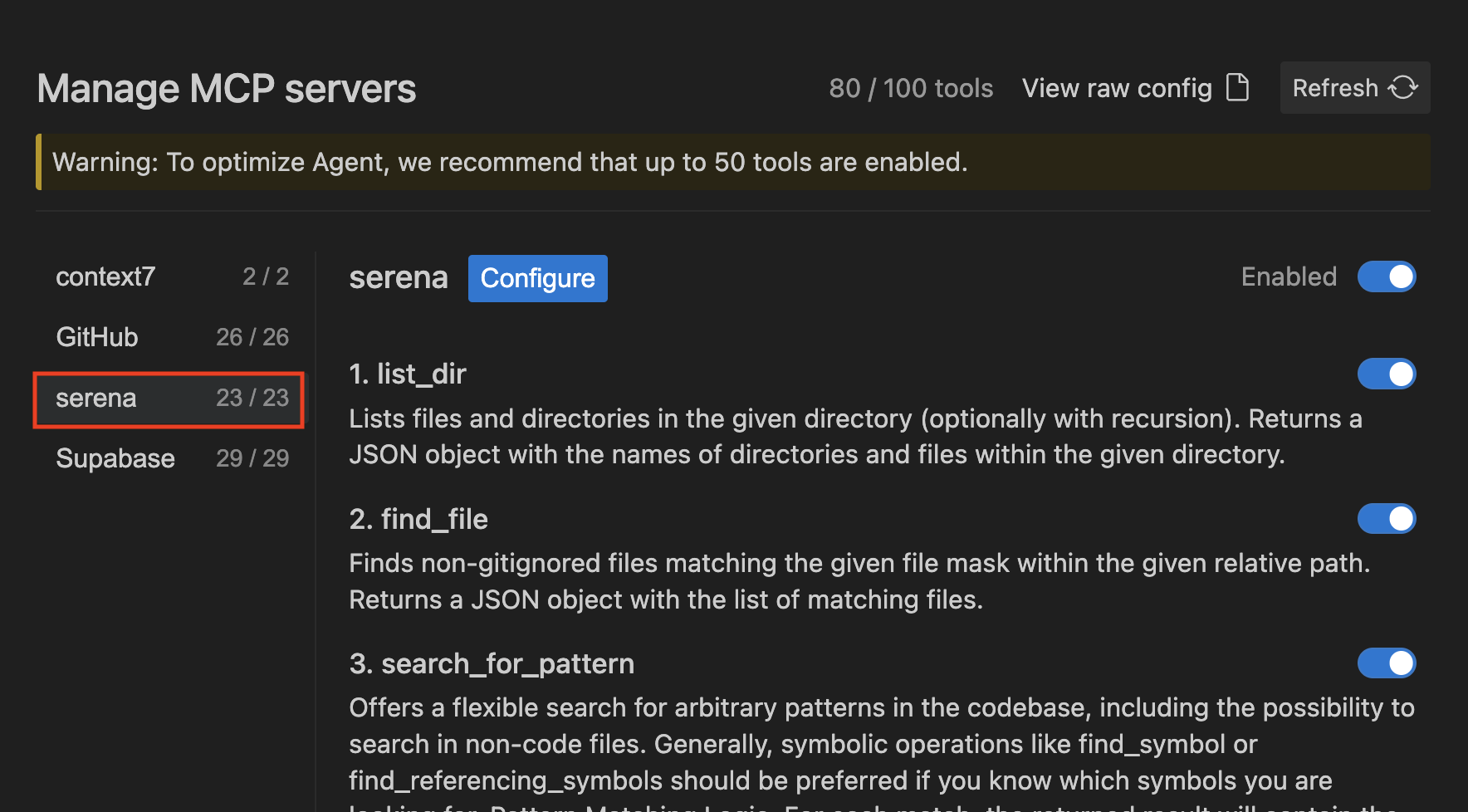 「Enabled」がオンになっており、右側に list_dir find_file search_for_pattern などのツールが表示されていれば導入成功です。