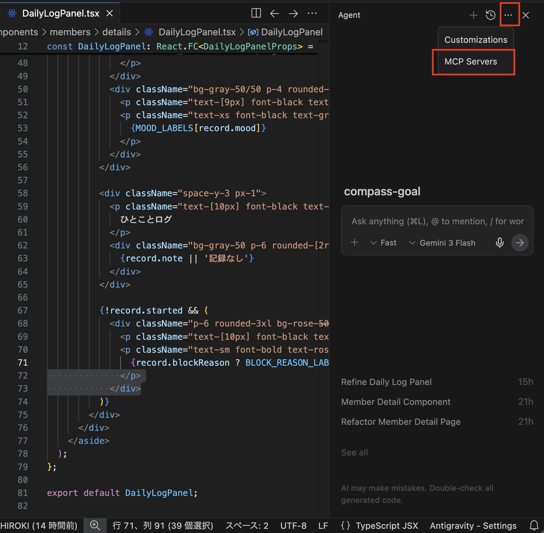 まずはエディタのAIチャット画面(Agentタブなど)を開きます。 画面右上にある「…(三点リーダー)」をクリックし、表示されるメニューから 「MCP Servers」 を選択します。