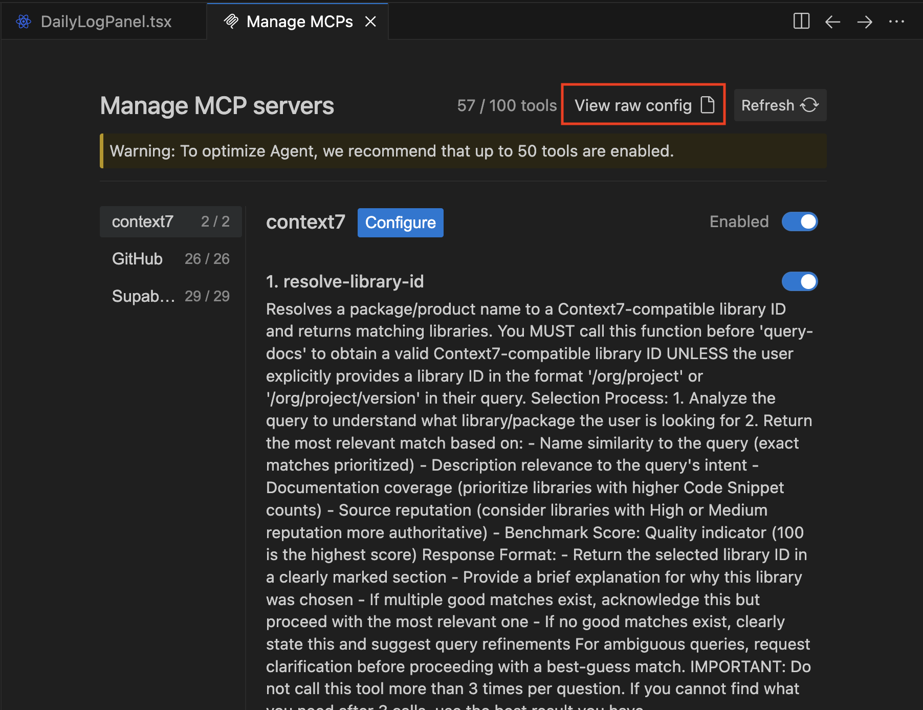 これを行うと、設定ファイル(.mcp.json またはそれに準ずる設定ファイル)が開きます。