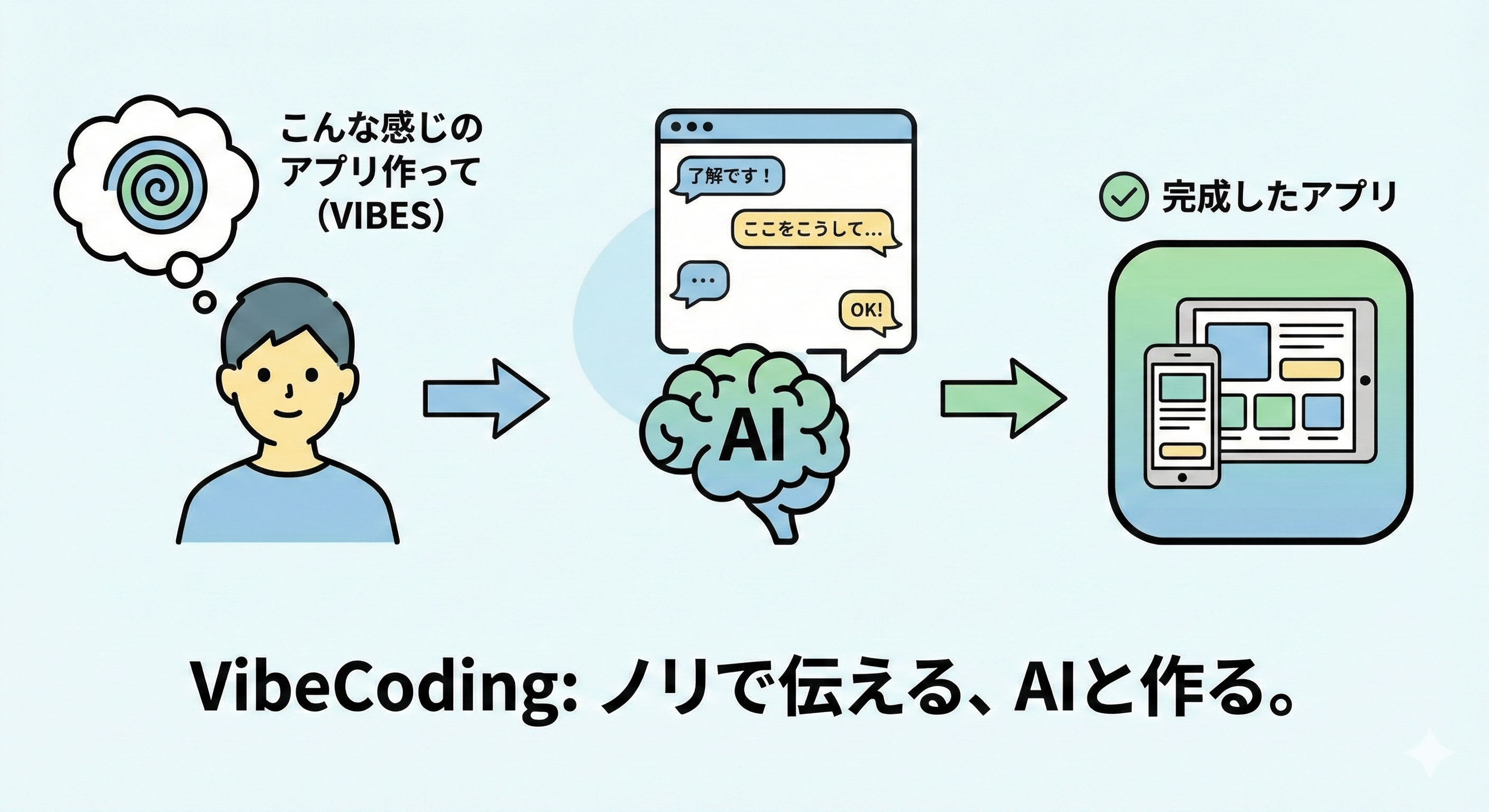 VibeCodingとは、人間が細かいソースコードを書くのではなく、自然言語(日本語や英語)で「こんな感じのアプリを作って」という「バイブス(ノリ・雰囲気)」をAIに伝え、対話を通じてアプリケーションを完成させる開発スタイルです。