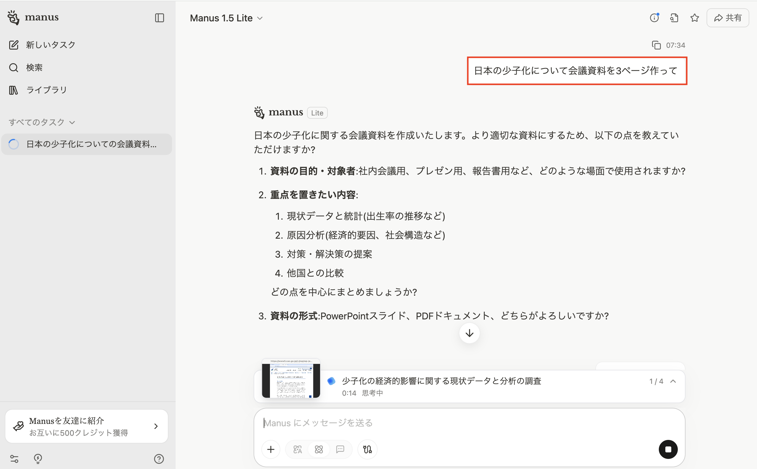 しかしManusは、「指示を理解して、必要な作業を自動的にこなす」ことができます。