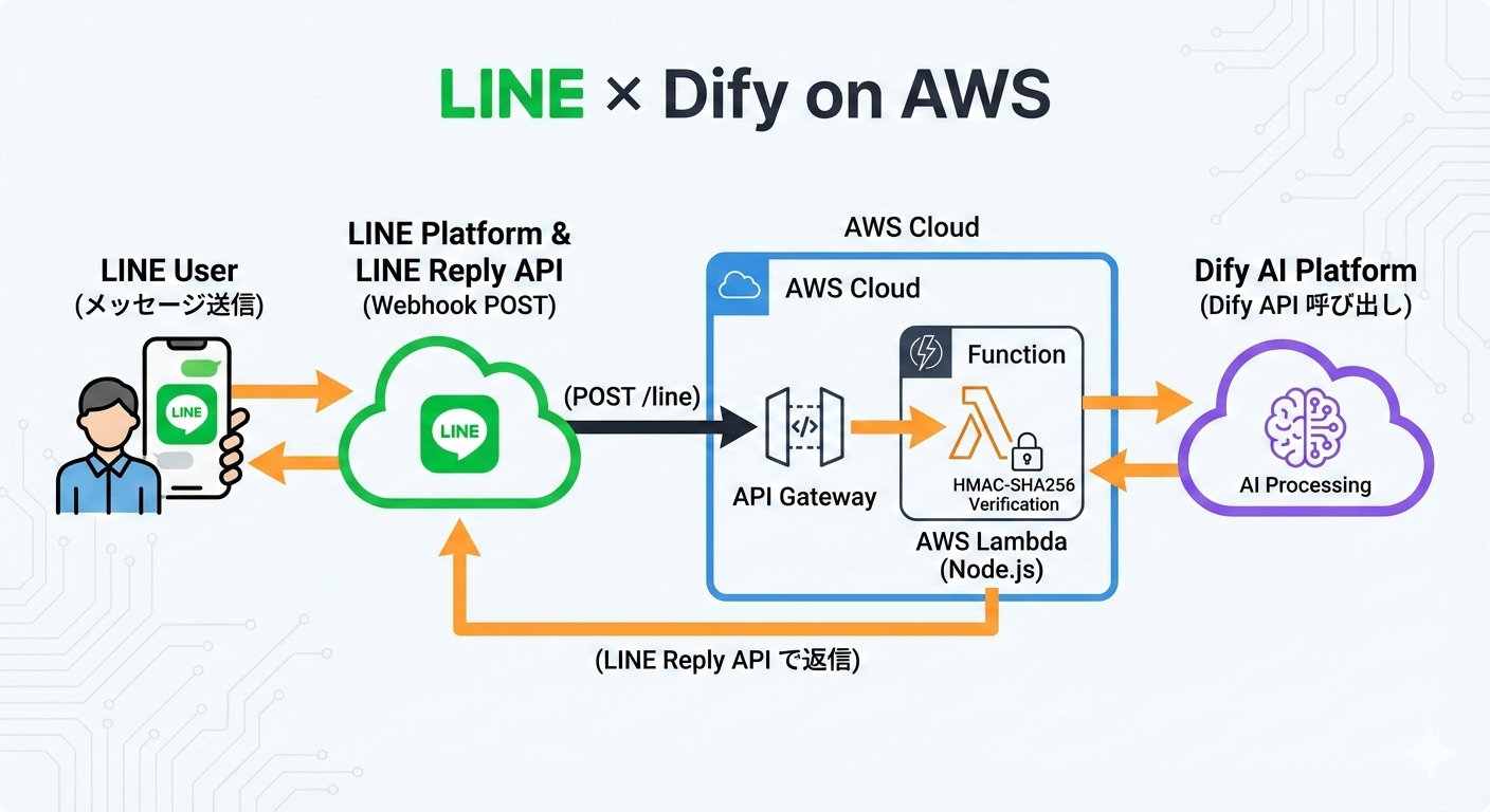 今回、これらの課題をすべて解決するため、AWS(クラウド)と最新の生成AI(Dify)を組み合わせた、独自のサーバーレスシステムを開発しました。