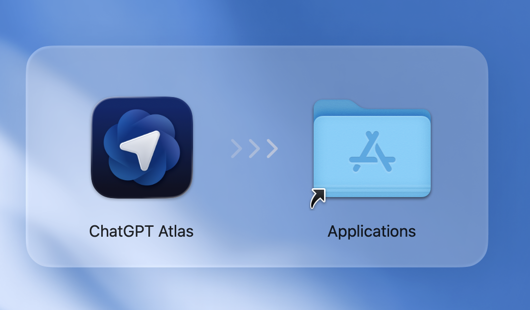 ダウンロードしたインストーラを開くと、ChatGPT AtlasのアイコンをApplicationsフォルダへドラッグする画面が表示されます。