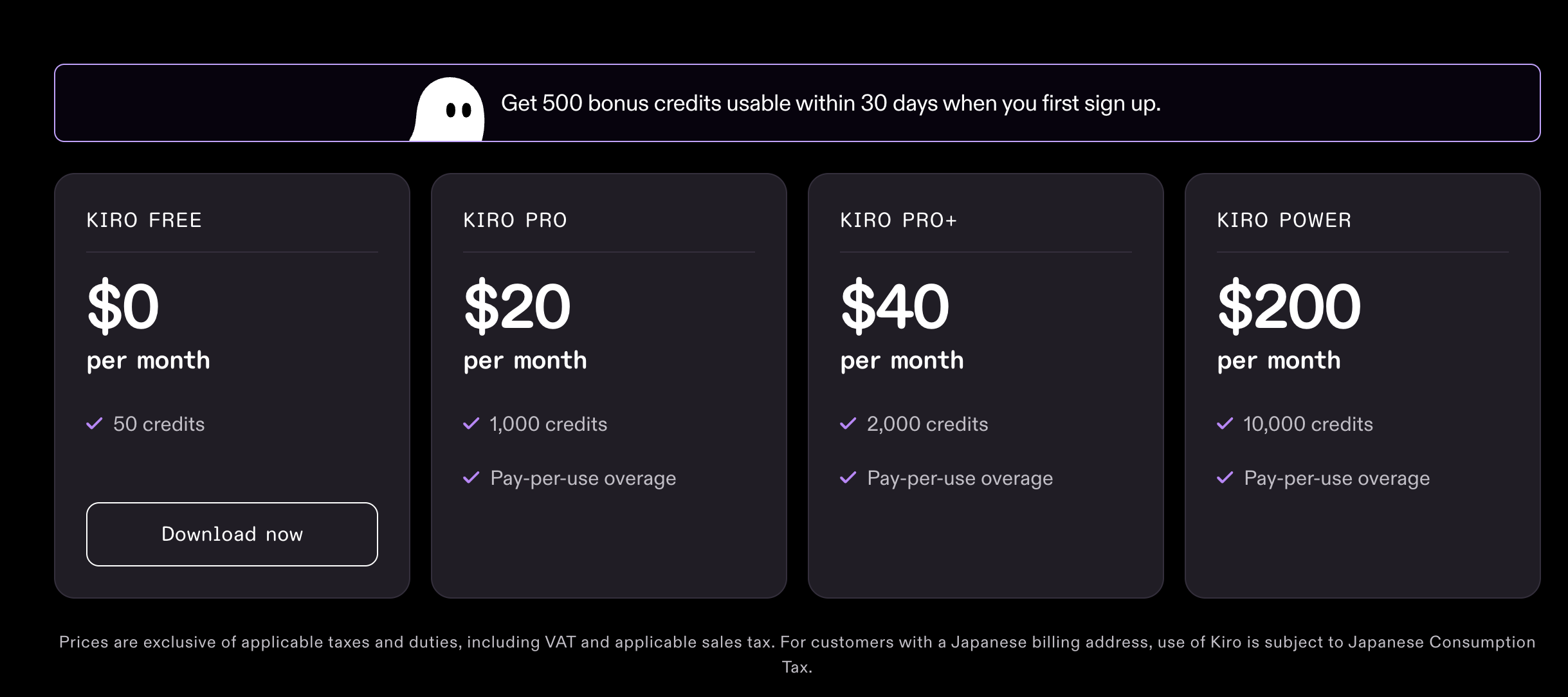 Free | $0 | 50 Vibe リクエスト / 0 Spec リクエスト | — | 新ユーザーには最初の 14 日間限定で +100 Vibe / +100 Spec のボーナスあり Kiro+2Kiro+2 |