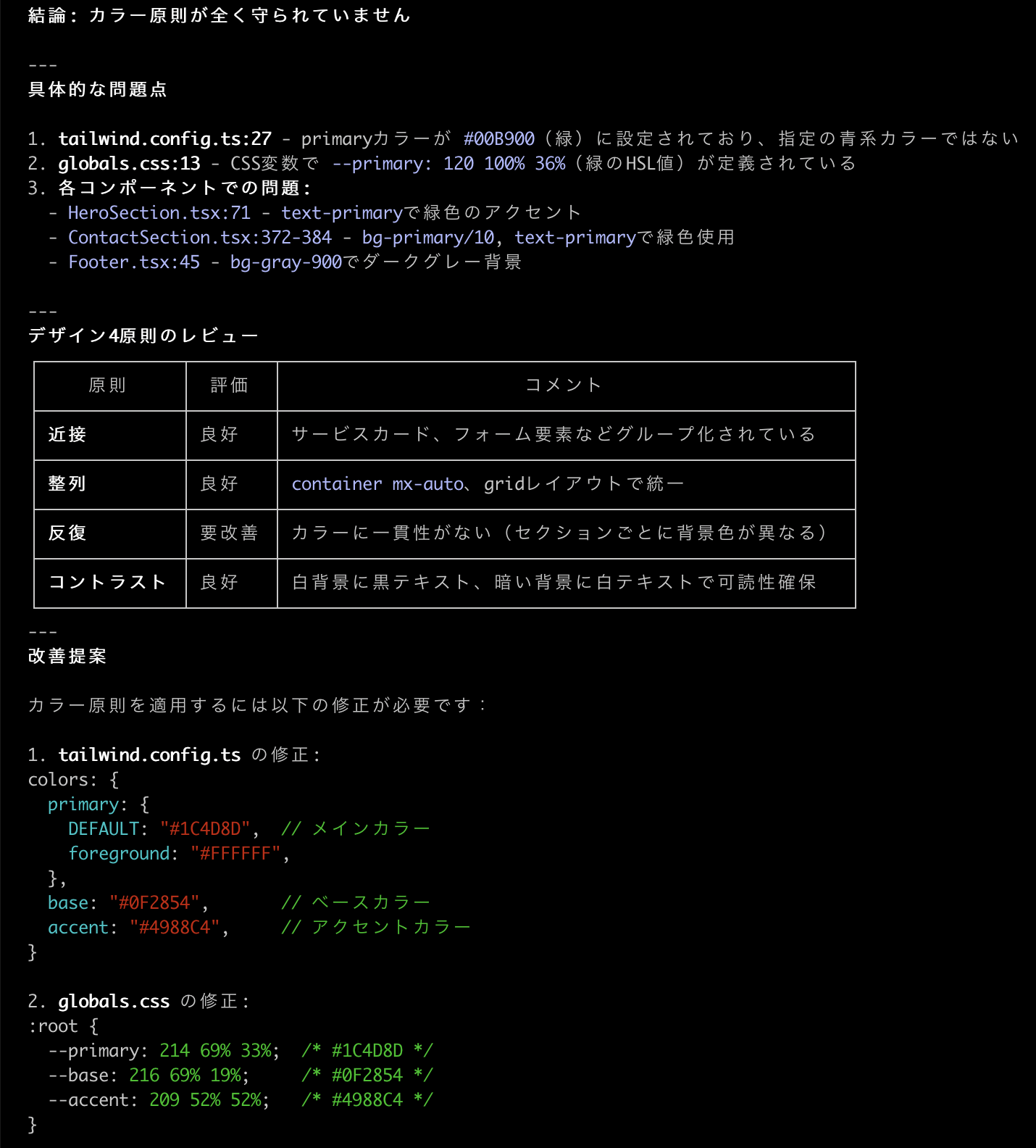 これだけで、Claudeは自律的にデザイン原則を読み込み、「メインカラーが多すぎてアクセントが死んでいますね」といったプロの視点でのフィードバックと、具体的な修正コードを提案してくれます。