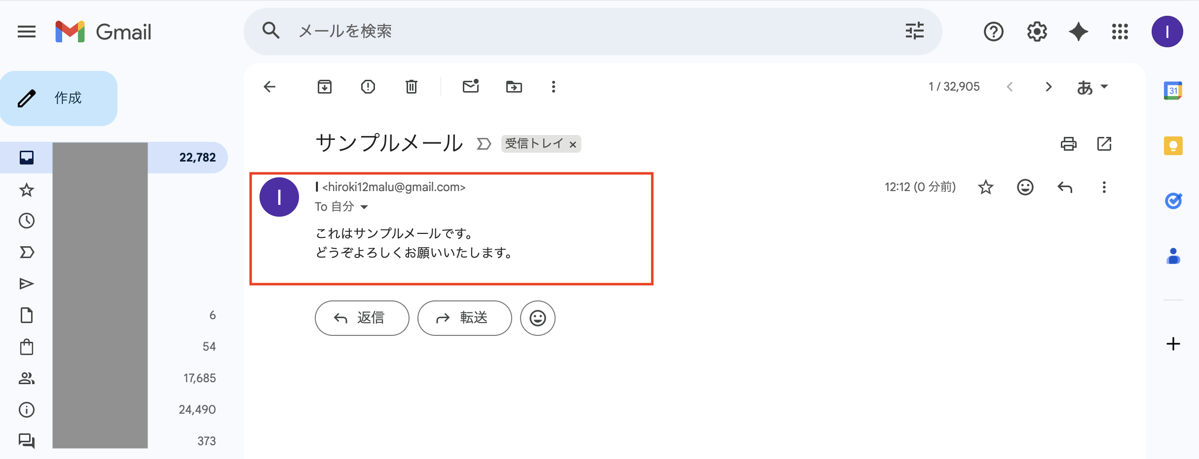 - 最後に、受信トレイを開くと、「これはサンプルメールです。どうぞよろしくお願いいたします。」という本文が確認できます。