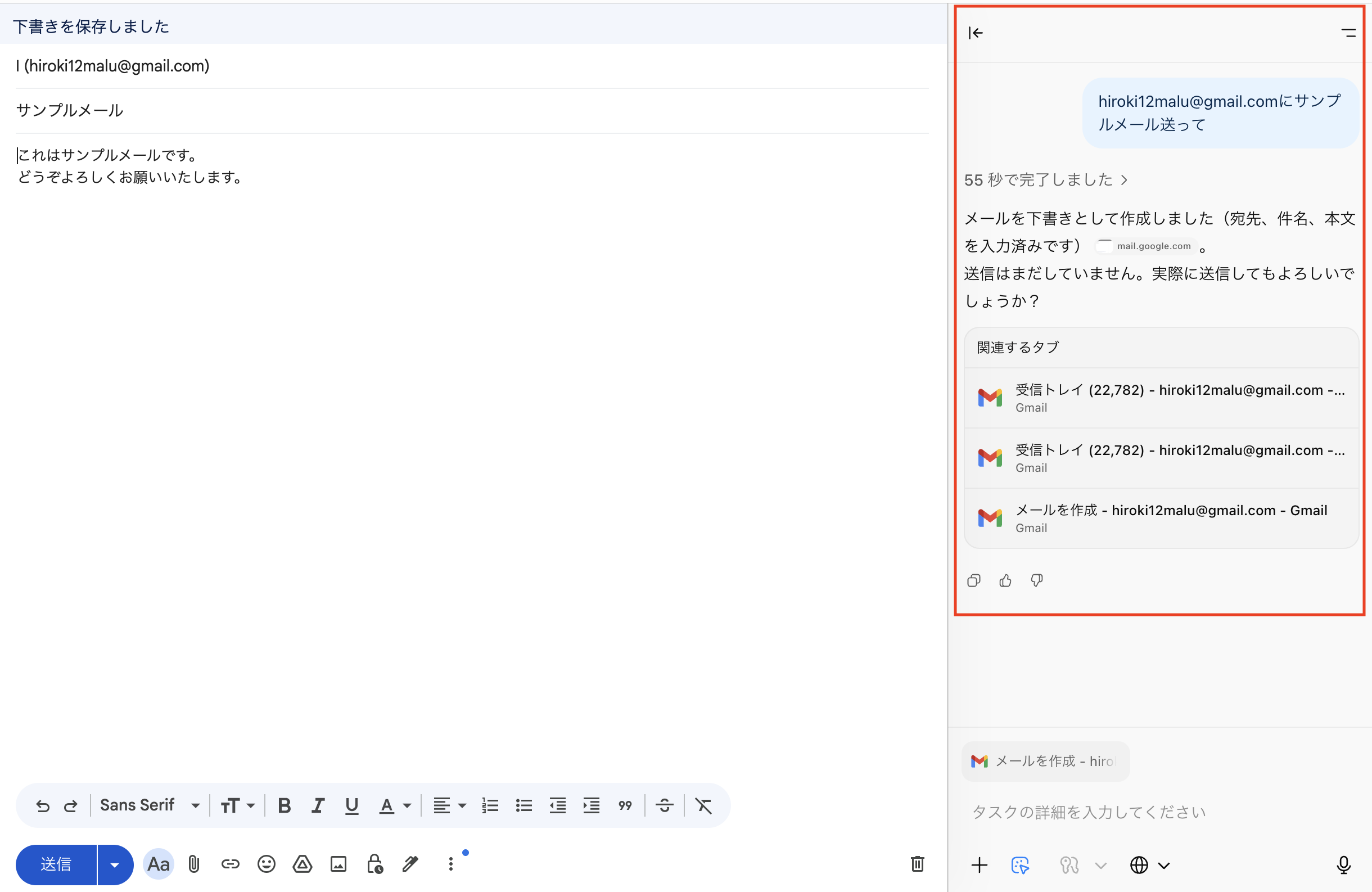 - AIが自動的にGmailを開き、新規メール作成画面を生成し、宛先・件名・本文を指定した内容で入力してくれます。(画面左側)
