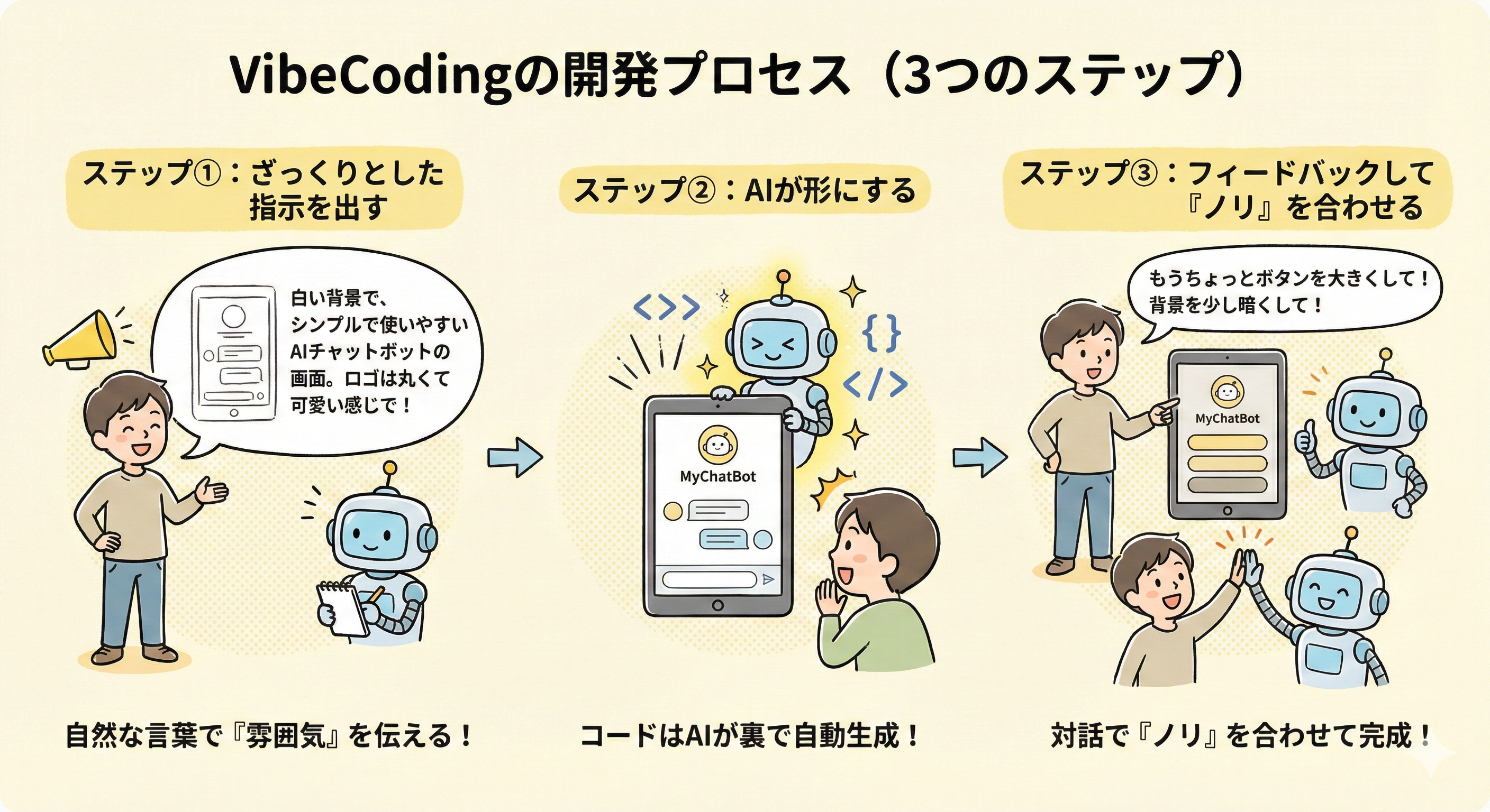 VibeCodingの進め方は、まるで熟練のエンジニアにお願いを出す「監督」のような感覚です。