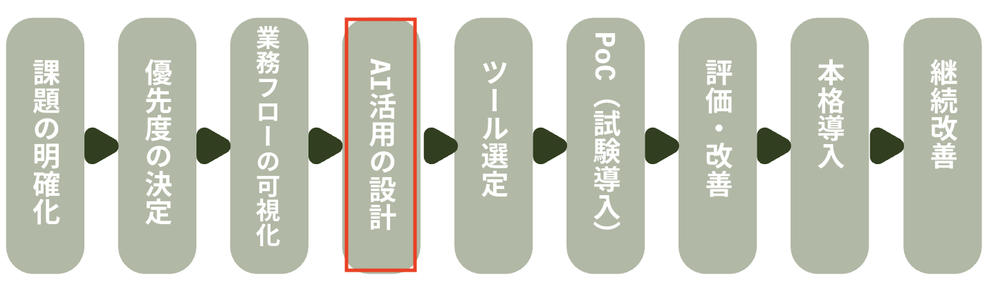 この「AI活用の設計」フェーズは、“AIをどのように業務へ組み込むか”を具体的に描く工程です。