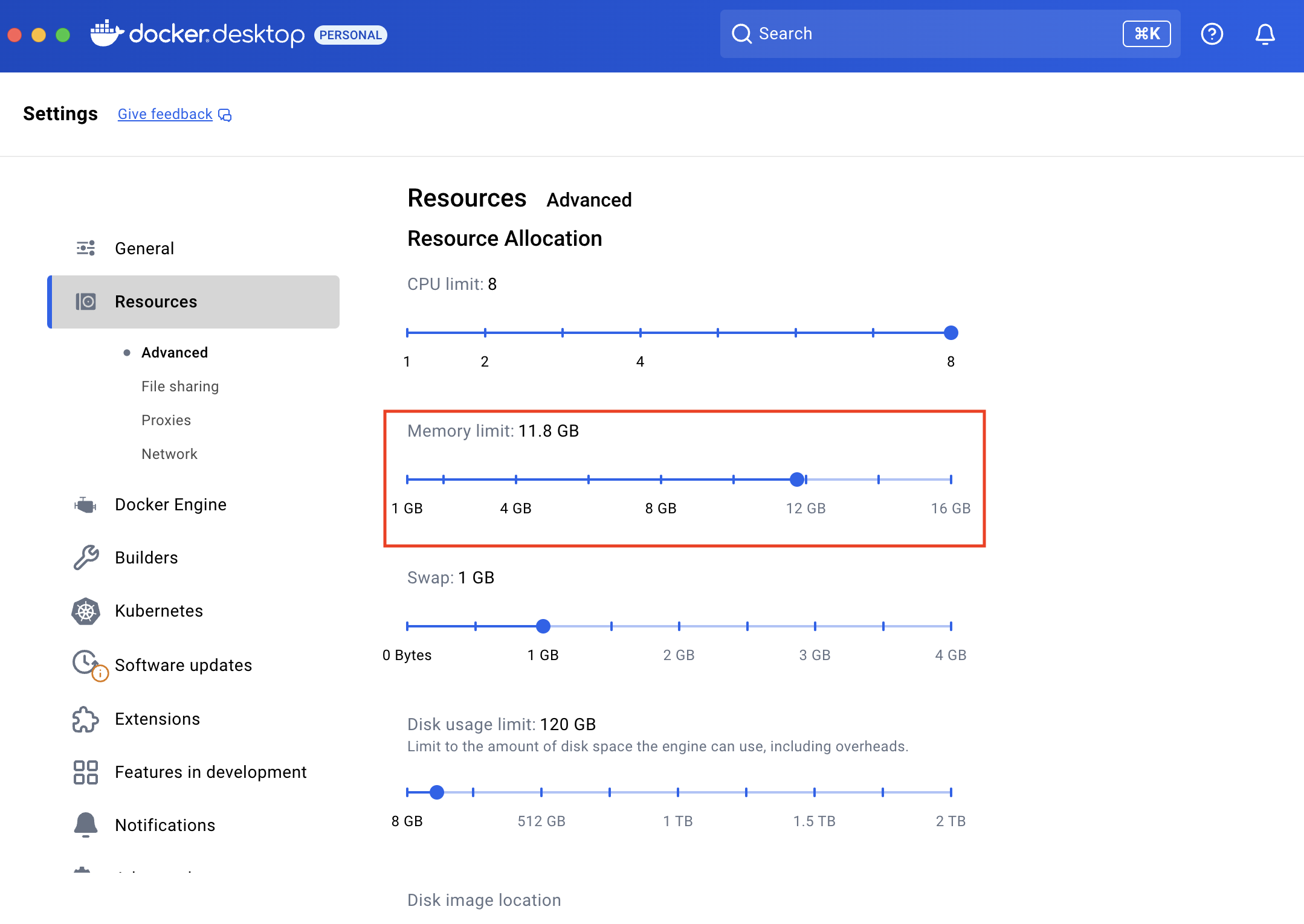 Docker Desktop(特にMacやWindows版)において、メモリ制限とは「Dockerという仮想環境が、PC全体のメモリのうち最大でどれくらい使ってよいか」を決める枠のことです。