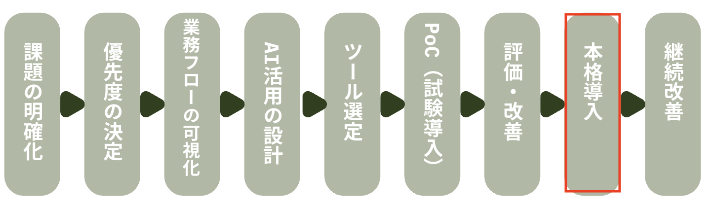 本格導入とは、PoCの学びをベースにAIを実際の業務に組み込み、定着させるフェーズ。
