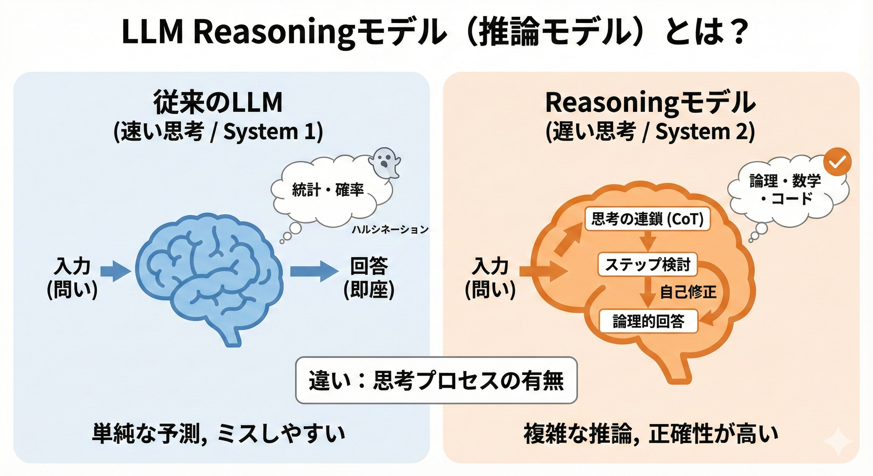 - Reasoningモデル: 問い → [内部的な思考の連鎖 (CoT)] → 回答