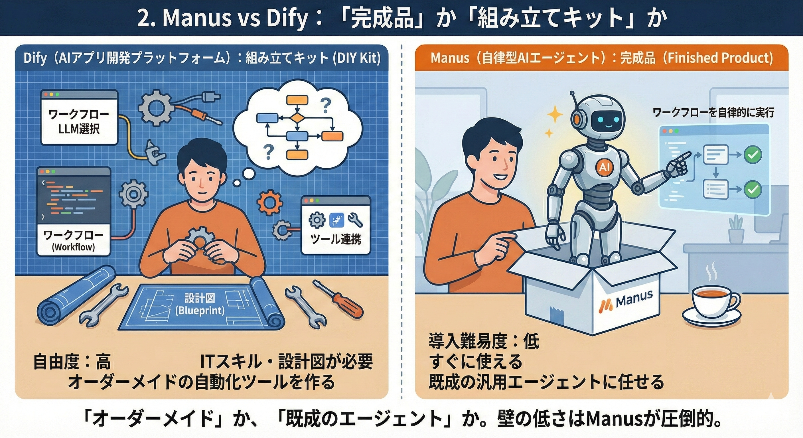 2. Manus vs Dify: 「完成品」か「組み立てキット」か