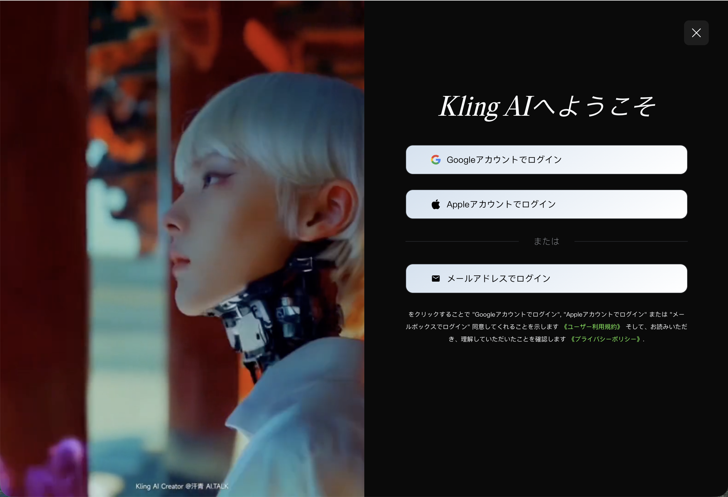 Kling AIの公式サイトにアクセスすると、ログイン画面が表示されます。「Googleアカウント」「Appleアカウント」または「メールアドレス」のいずれか好きな方法を選択し、ログイン(初回はアカウント登録)を済ませましょう。