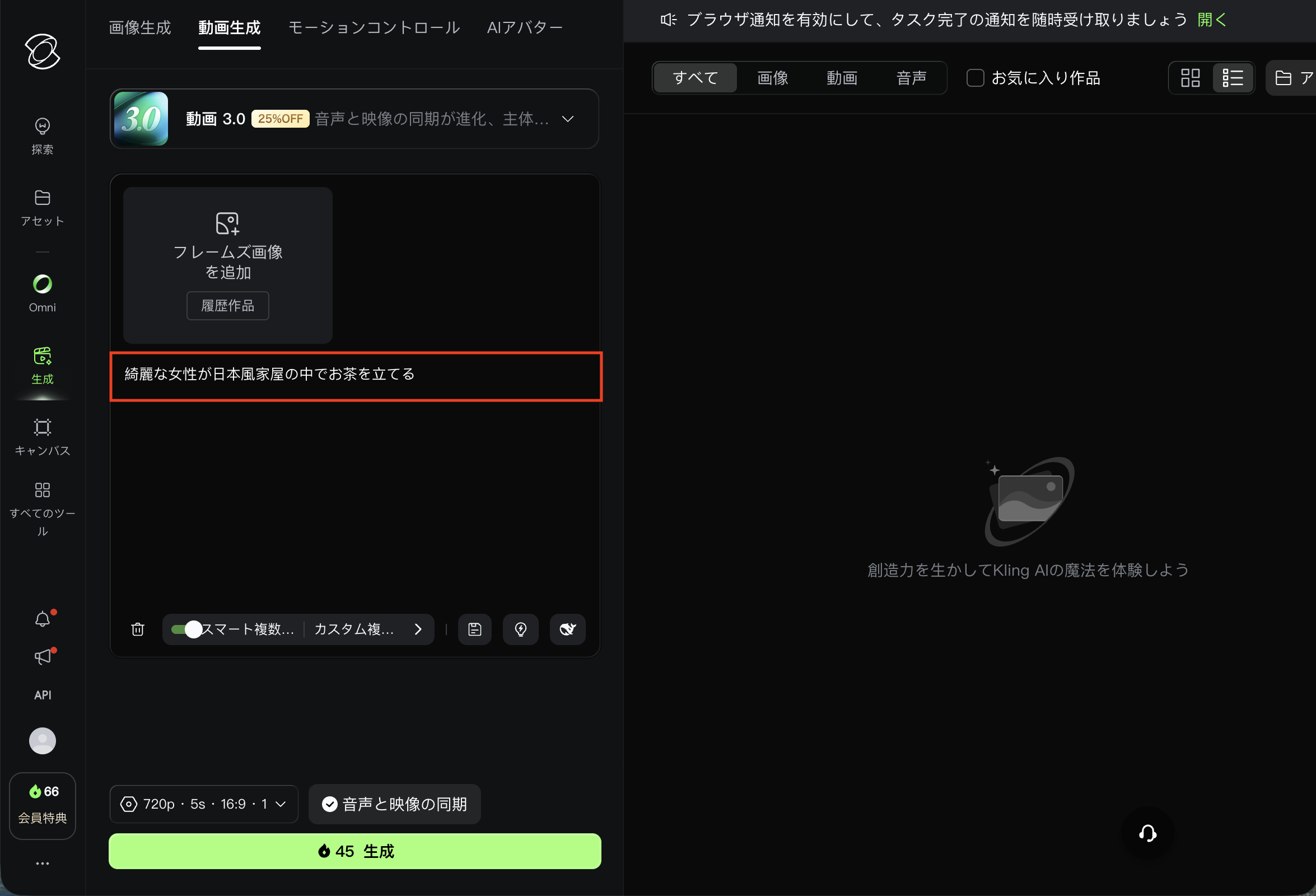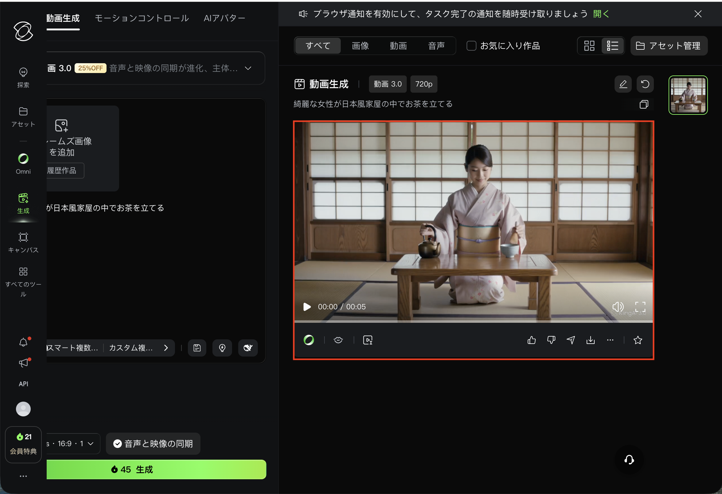 ログイン後、左側のメニューから「生成(動画生成)」の画面を開きます。 画面左側にあるテキスト入力欄に、作成したい動画の内容を入力します。今回は例として「綺麗な女性が日本風家屋の中でお茶を立てる」と入力しました。 入力が完了したら、画面下部にある緑色の「生成」ボタンをクリックします。