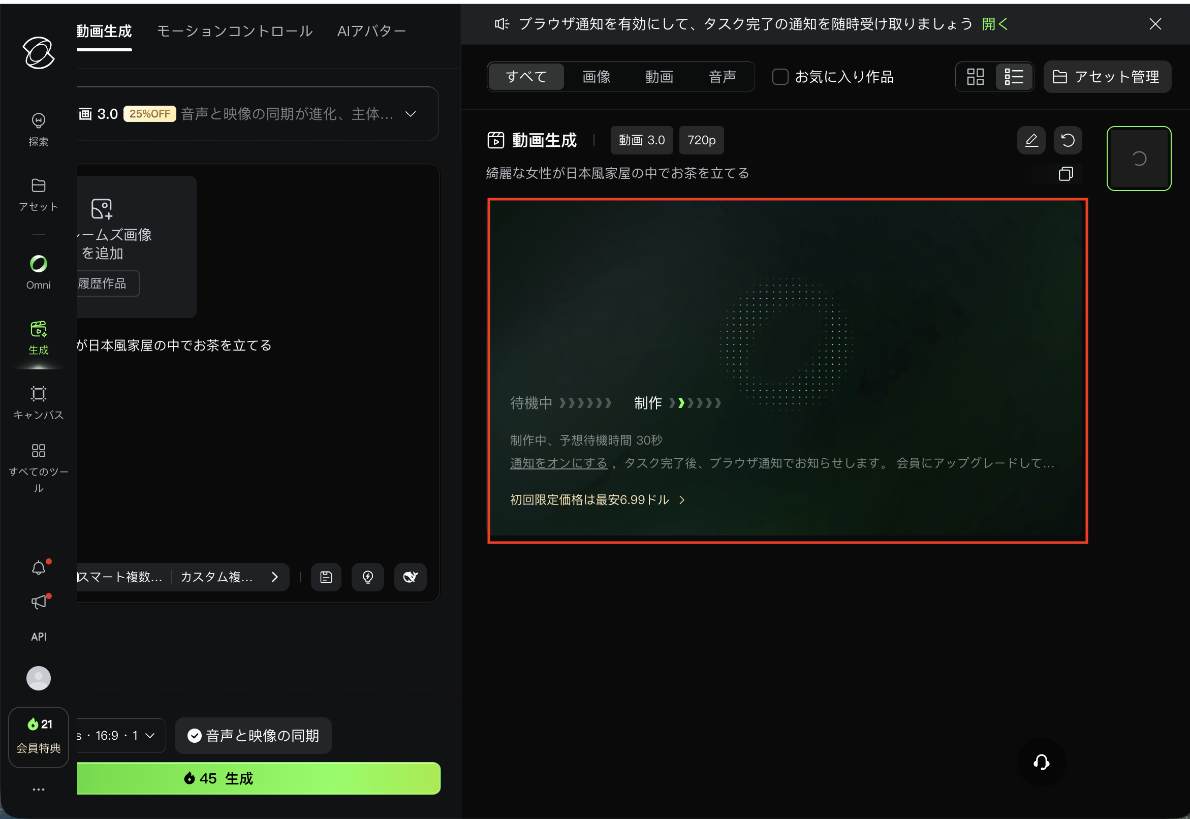 生成ボタンを押すと、画面右側のエリアにタスクが追加され、制作状況が表示されます。「待機中」から「制作」へとステータスが進み、予想待機時間(今回の例では30秒)が表示されます。ブラウザを開いたまま、完成までしばらく待ちましょう。
