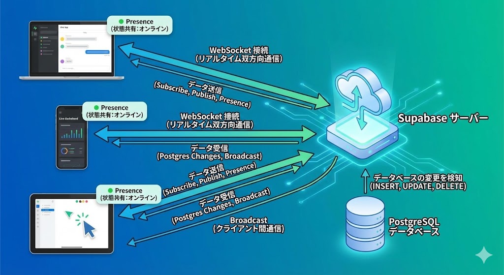 Supabase Realtimeは、WebSocketを利用してクライアントとサーバー間でリアルタイムな双方向通信を可能にする機能です。PostgreSQLデータベースの変更を即座にクライアントへ通知したり、データベースを経由せずにクライアント同士でメッセージをやり取りしたりすることができます。