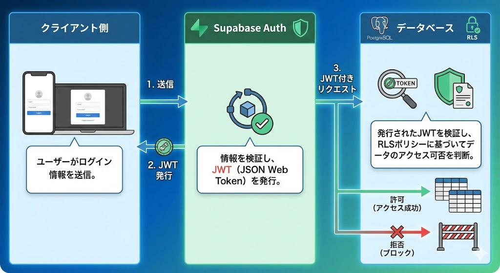 - データベース:発行されたJWTを検証し、RLSポリシーに基づいてデータのアクセス可否を判断。