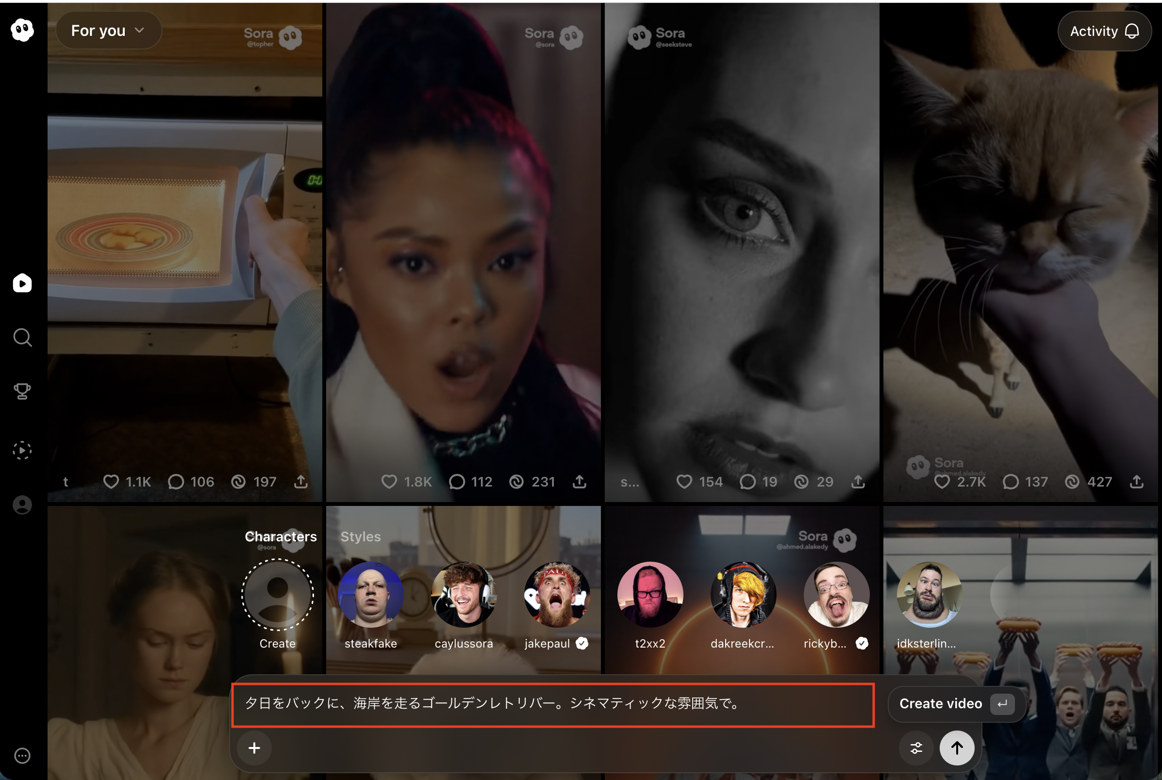 基本的な使い方は、「どんな動画にしたいか」をテキスト(プロンプト)で入力するだけ。すると、AIがその指示を理解し、最長1分間ものリアルで滑らかな動画を生成してくれます。単なるアニメーションではなく、実写と見間違えるほどのクオリティが世界中に大きな衝撃を与えました。