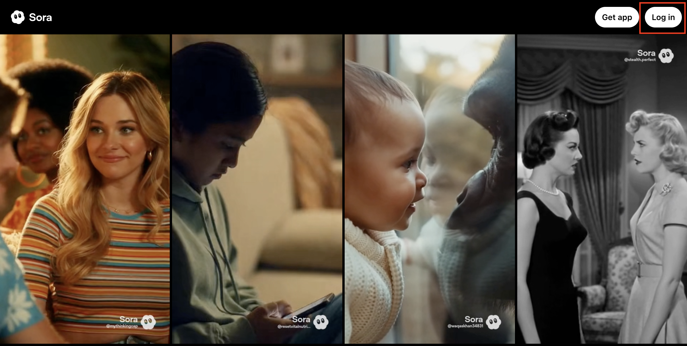 Soraの公式サイト(sora.com)またはアプリにアクセスし、「Log in」を選択します。ChatGPTなどでお馴染みの「OpenAIアカウント」を使用してログイン・サインアップを行います。