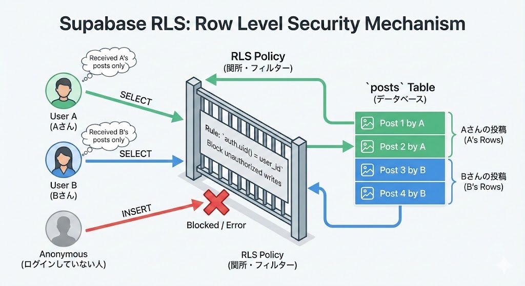 Supabaseを使った開発において、RLSは単なる「おまけのセキュリティ機能」ではなく、アーキテクチャの根幹を支える必須機能です。