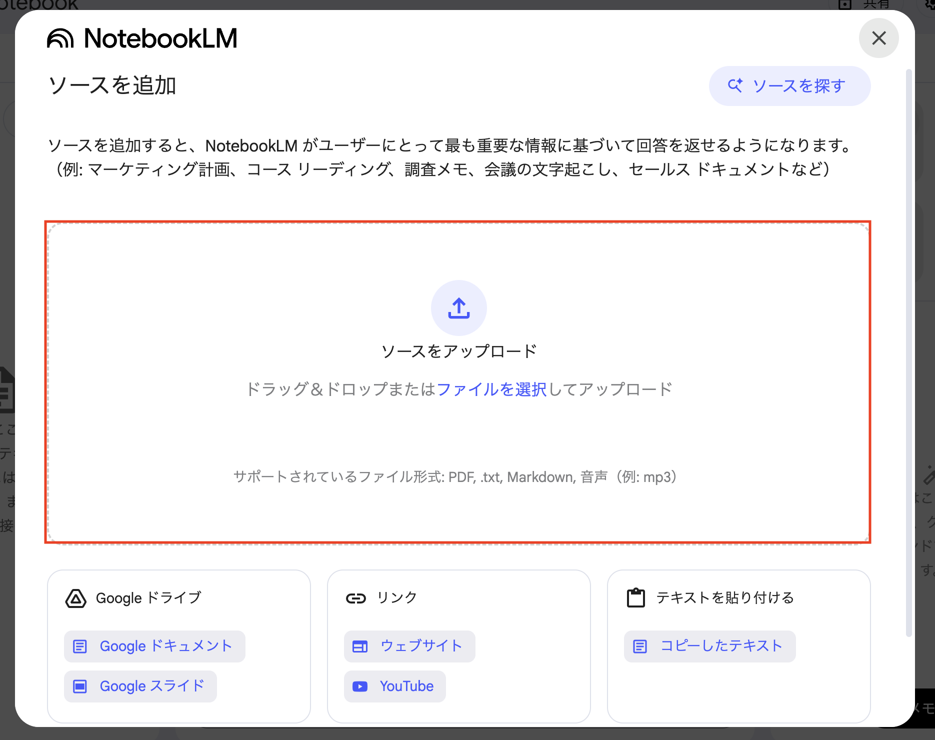 新規ノートブックを作成すると、まずは 情報の元となるソース を追加する画面が表示されます。