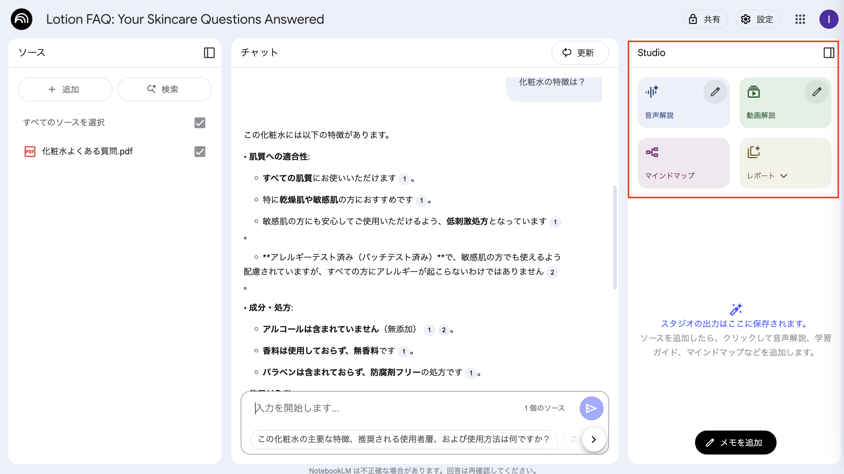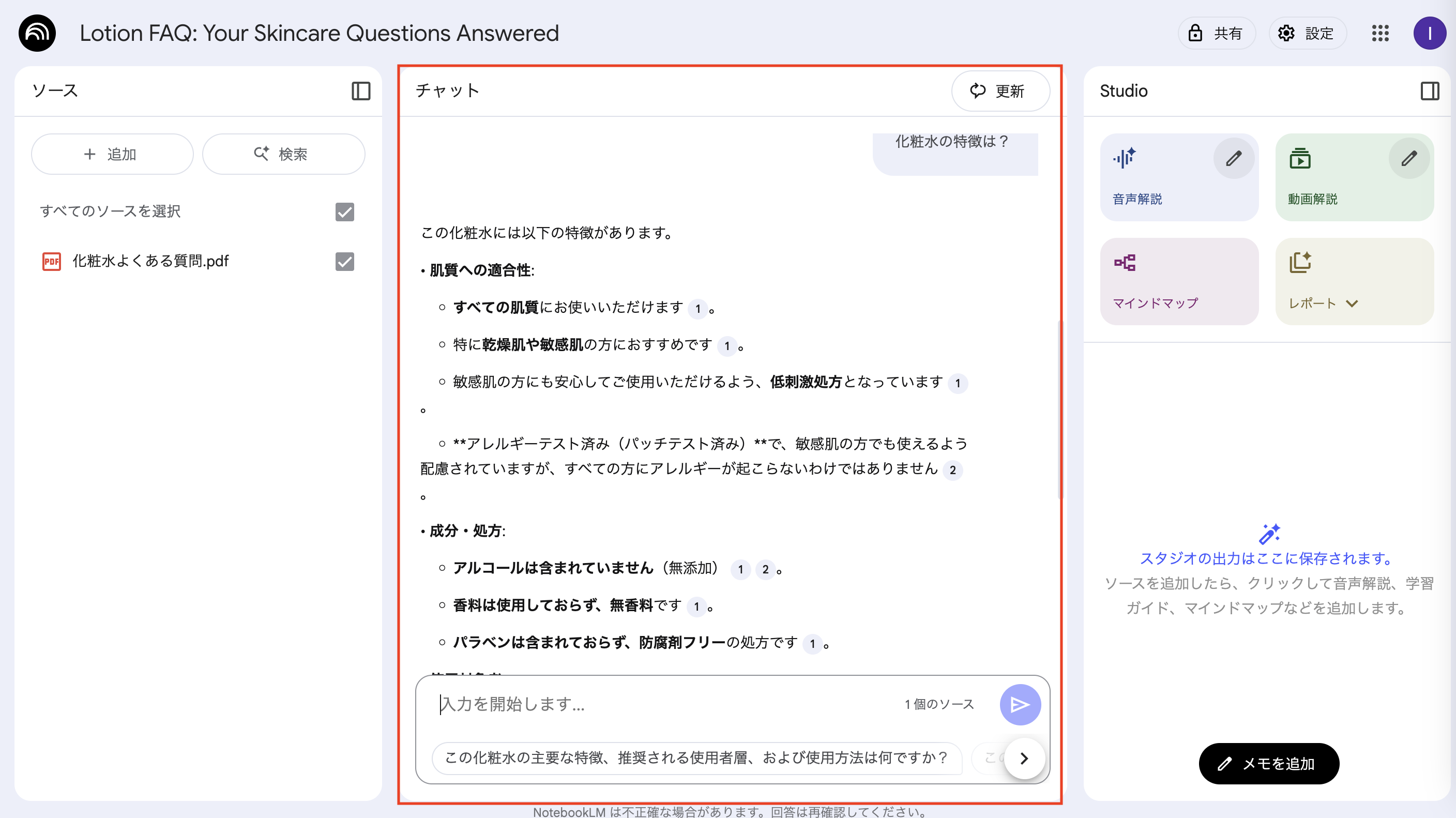 たとえば「この化粧水の特徴は?」と入力すると、アップロードしたPDFをもとにNotebookLMが要点を整理して回答してくれます。