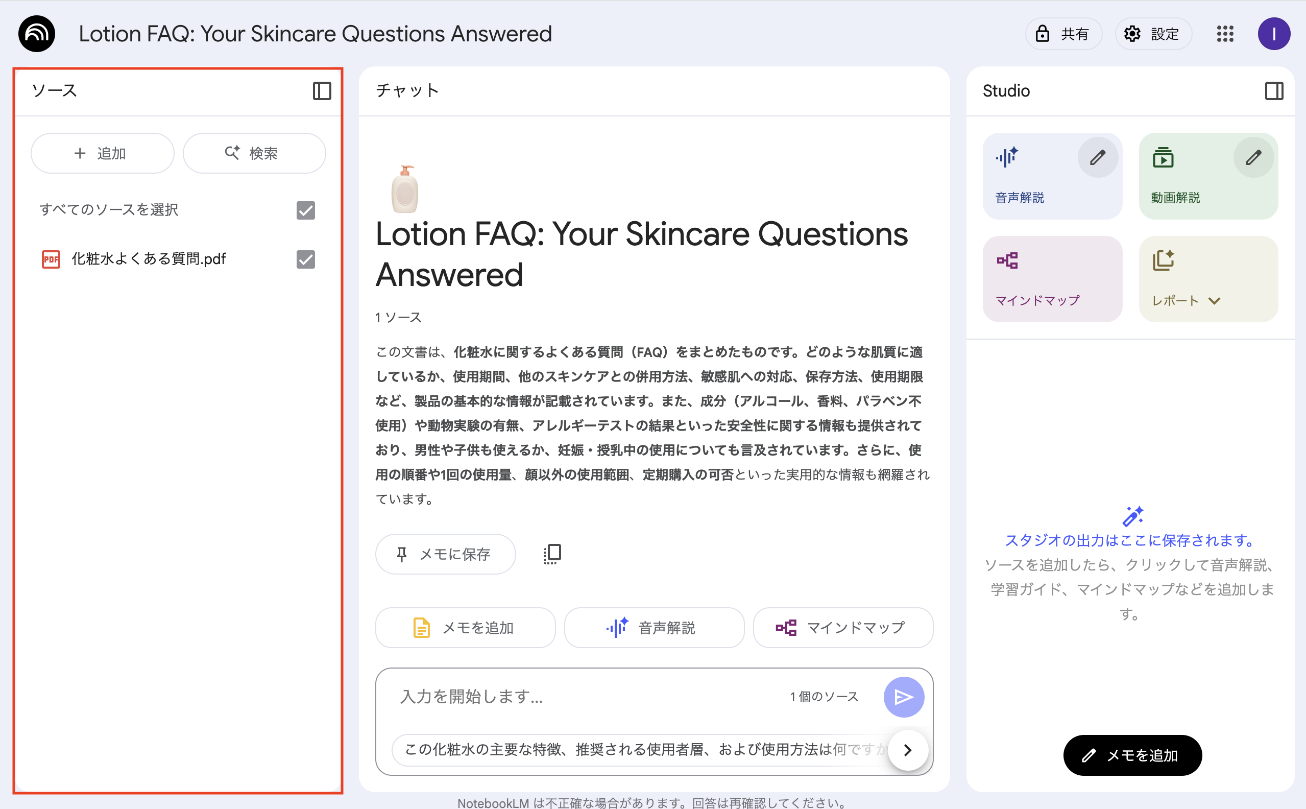 例えば自社商品の化粧水の質問をまとめた「化粧水のFAQ.pdf」をアップロードすると、その内容をNotebookLMが学習し、質問に答えられるようになります