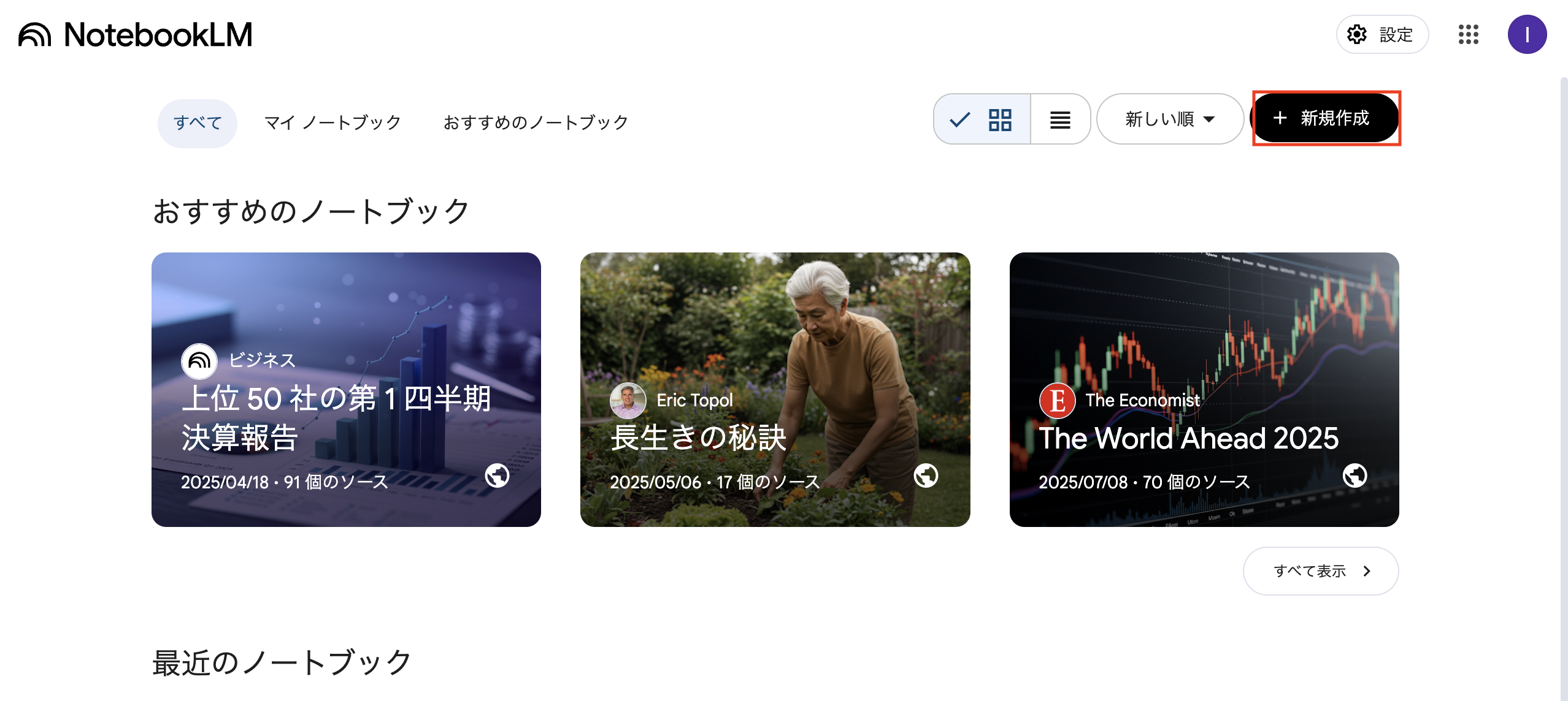 NotebookLMにログインすると、ホーム画面に「おすすめのノートブック」が並んでいます。