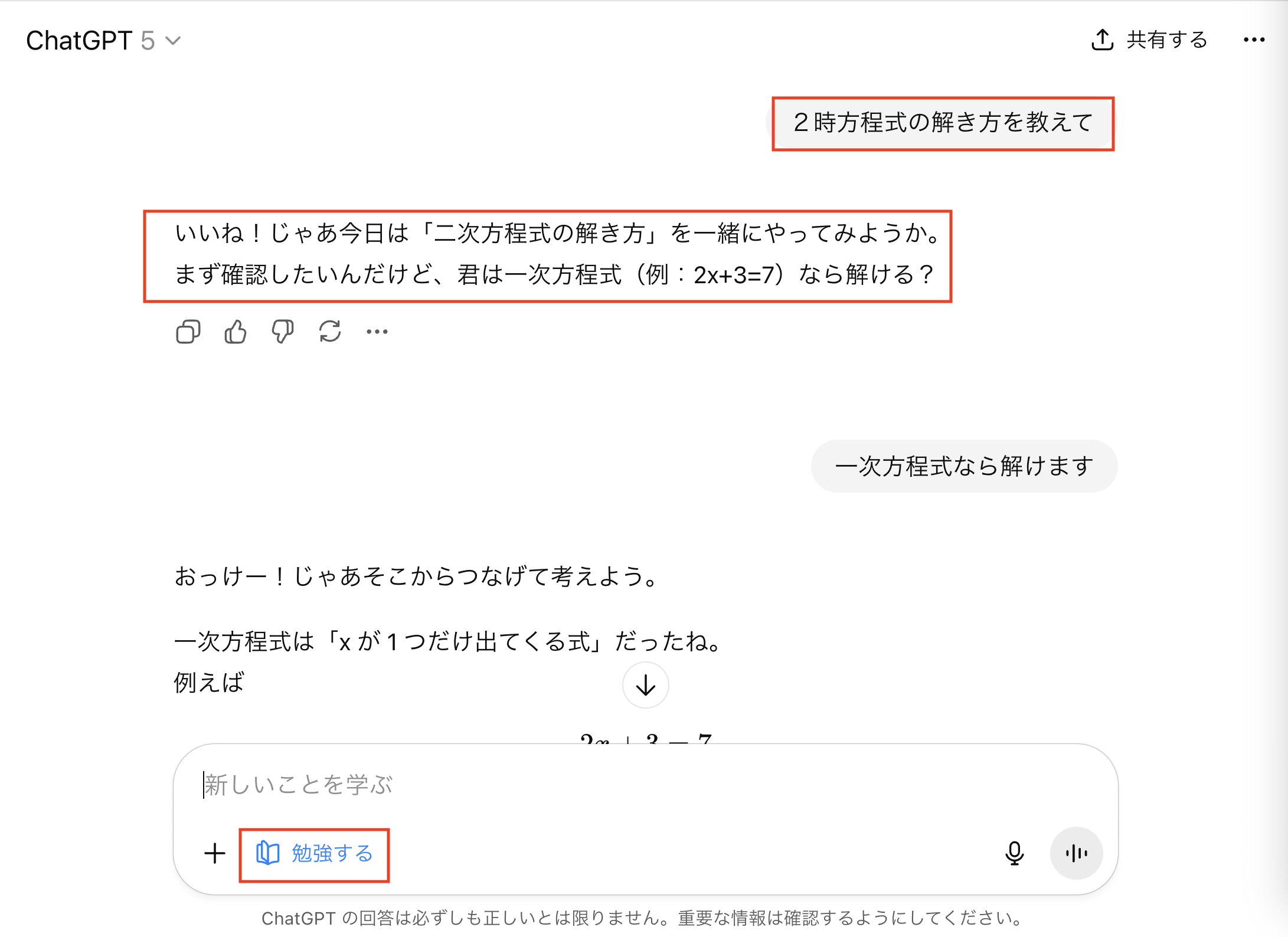 ChatGPT学習モードとは、すぐに回答を示すのではなく、段階的に考えながら理解を深められるよう学習をサポートします。