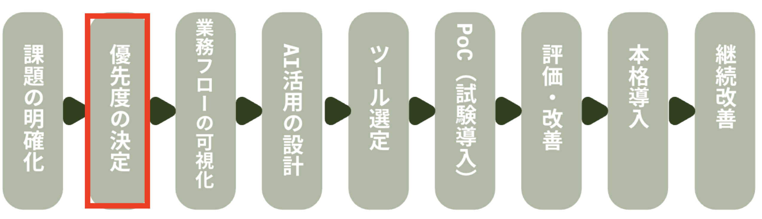 AI導入を成功させるカギは、課題を明確にしたうえで、「どこから始めるか」=優先度の決定 にあります。