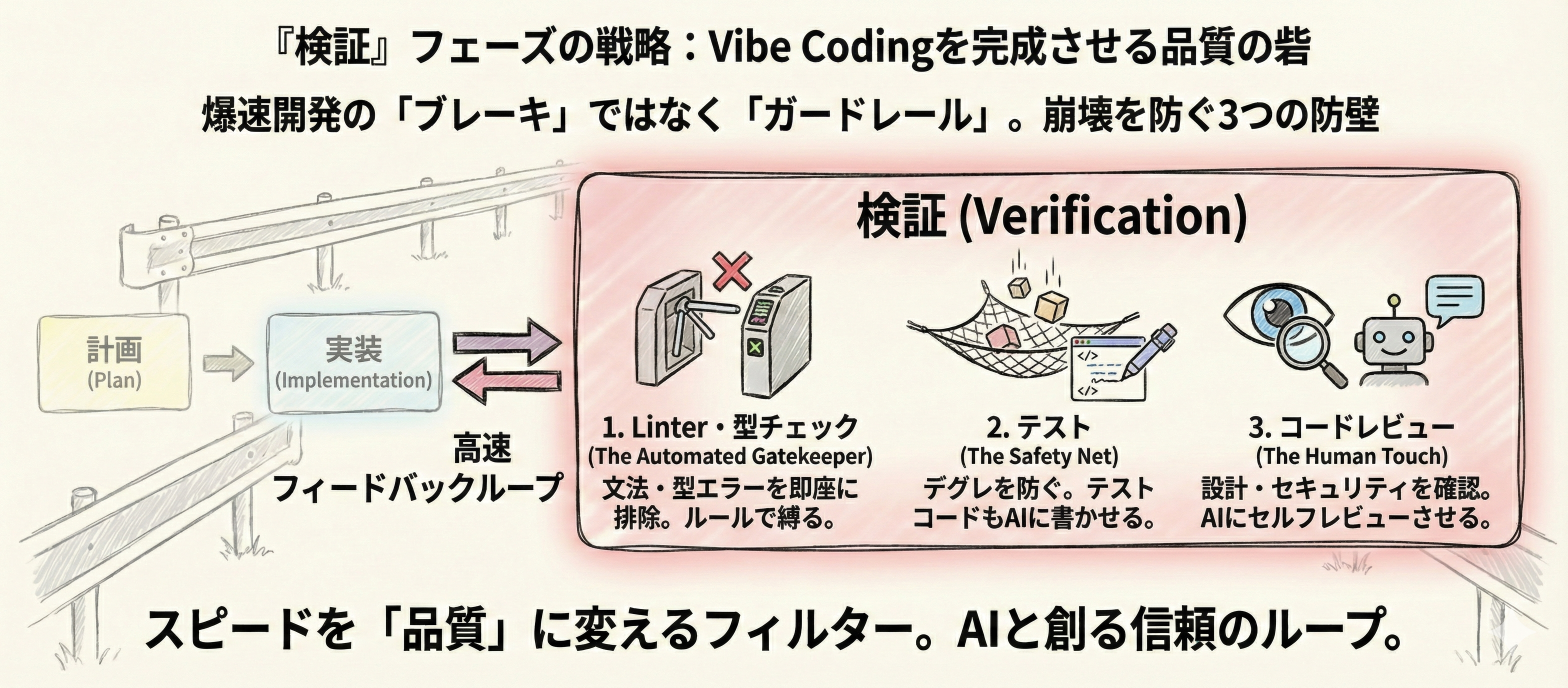 Vibe Codingにおいて、検証フェーズは3つの層で構成されています。