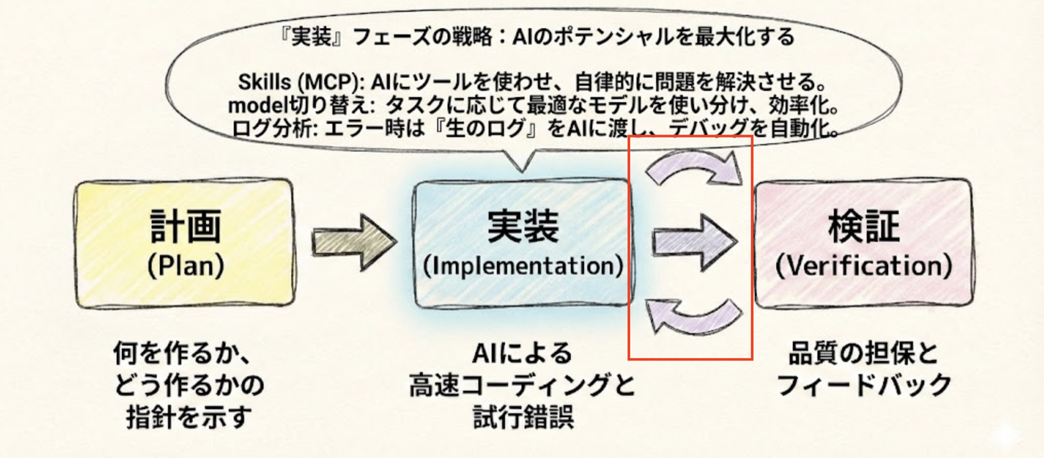 - 実装(Implementation): ツールとモデルを使い分け、爆速で形にする。