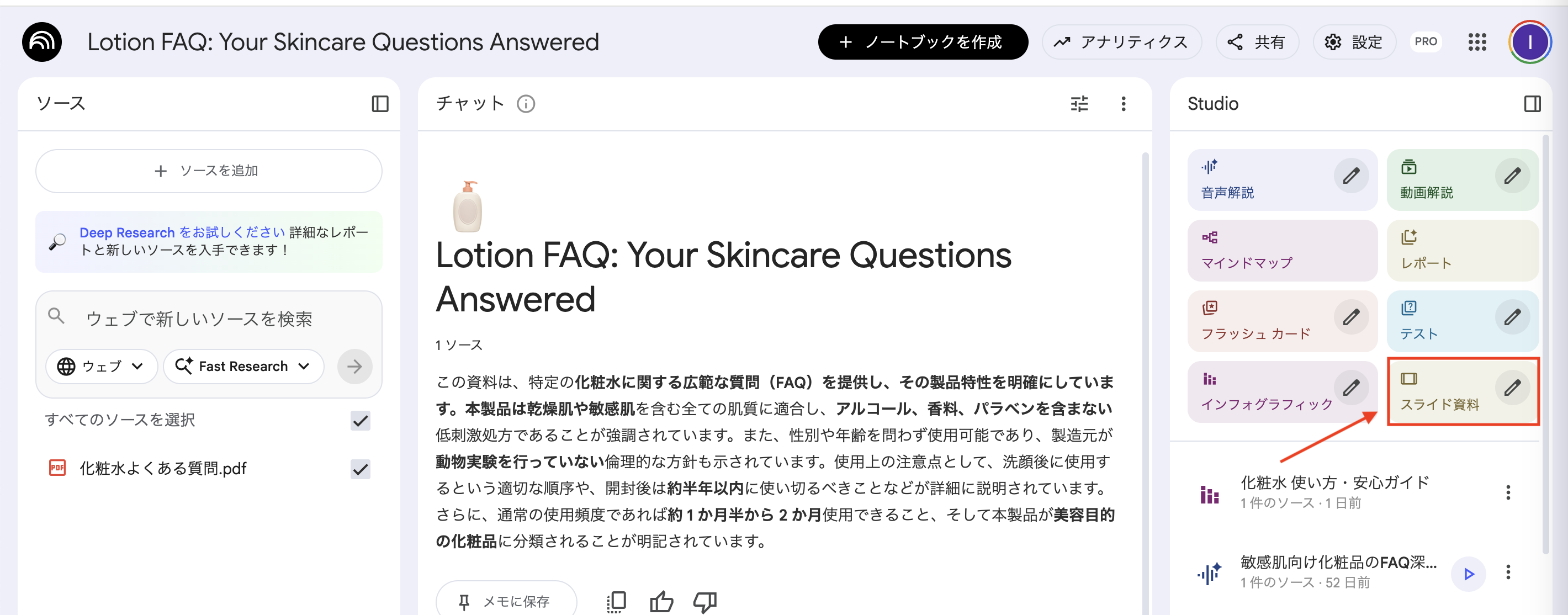 通常、資料を読み込んで要点を整理し、スライドの構成(目次、各スライドのタイトル、本文)を考えるには数時間かかります。NotebookLMなら、ソースを選択してボタンを押すだけ。数秒〜数十秒でスライドの構成案が出来上がります。