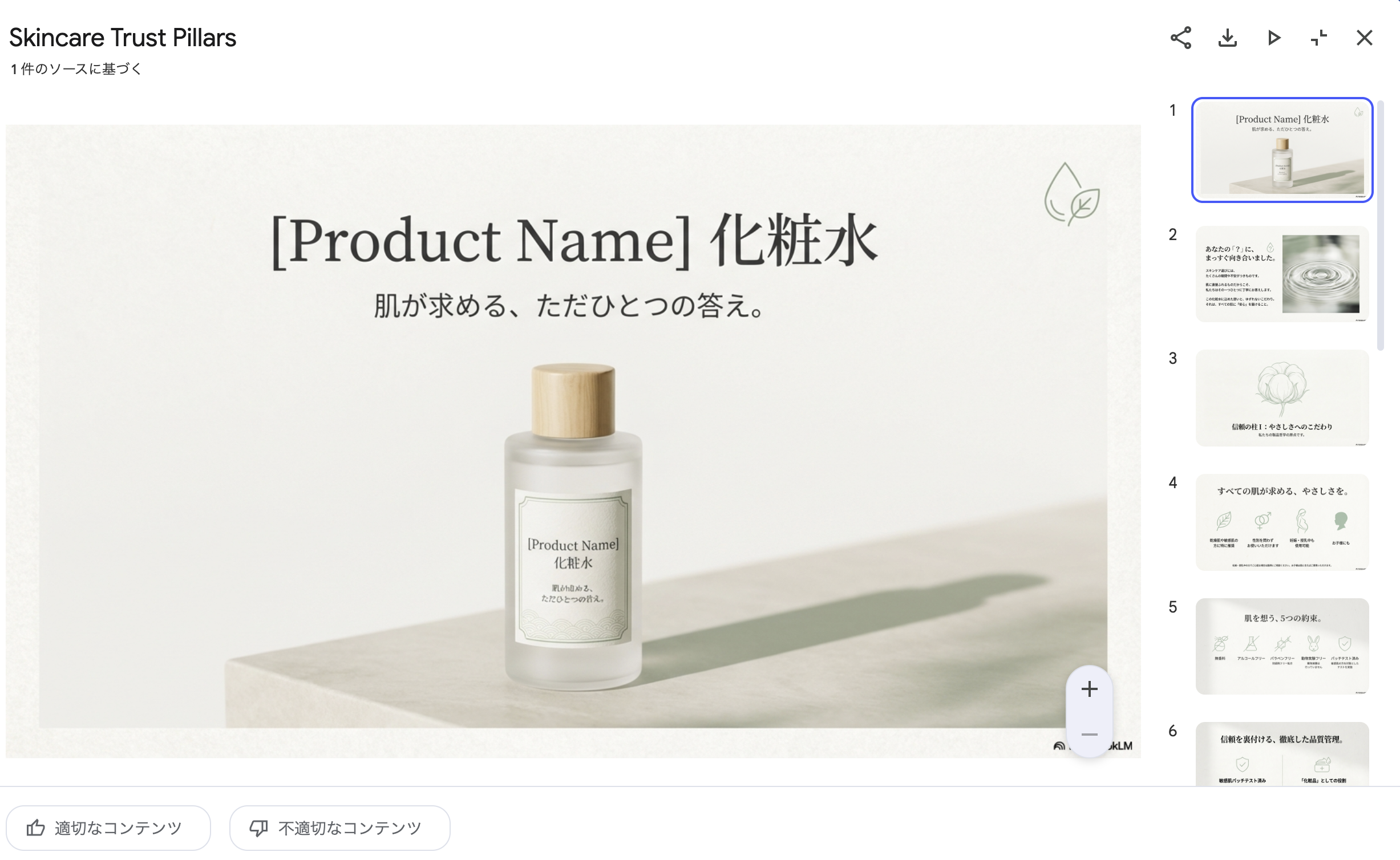 一般的な生成AI(ChatGPTなど)にスライドを作らせると、もっともらしい嘘(ハルシネーション)が含まれるリスクがあります。しかし、NotebookLMは「アップロードしたソース資料のみ」に基づいて情報を抽出するため、事実に基づいた信頼性の高いスライド構成が作れます。