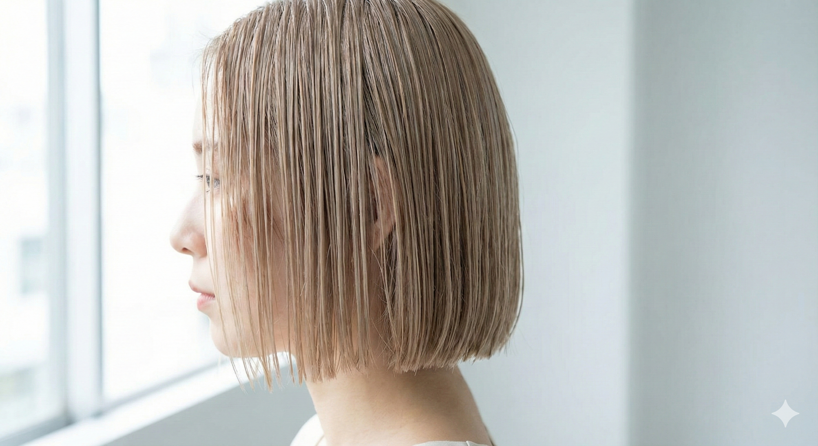 プロンプト(コピー用): Blunt bob, chin length, straight hair, sheer beige color, wet texture, simple, natural lighting, side profile.