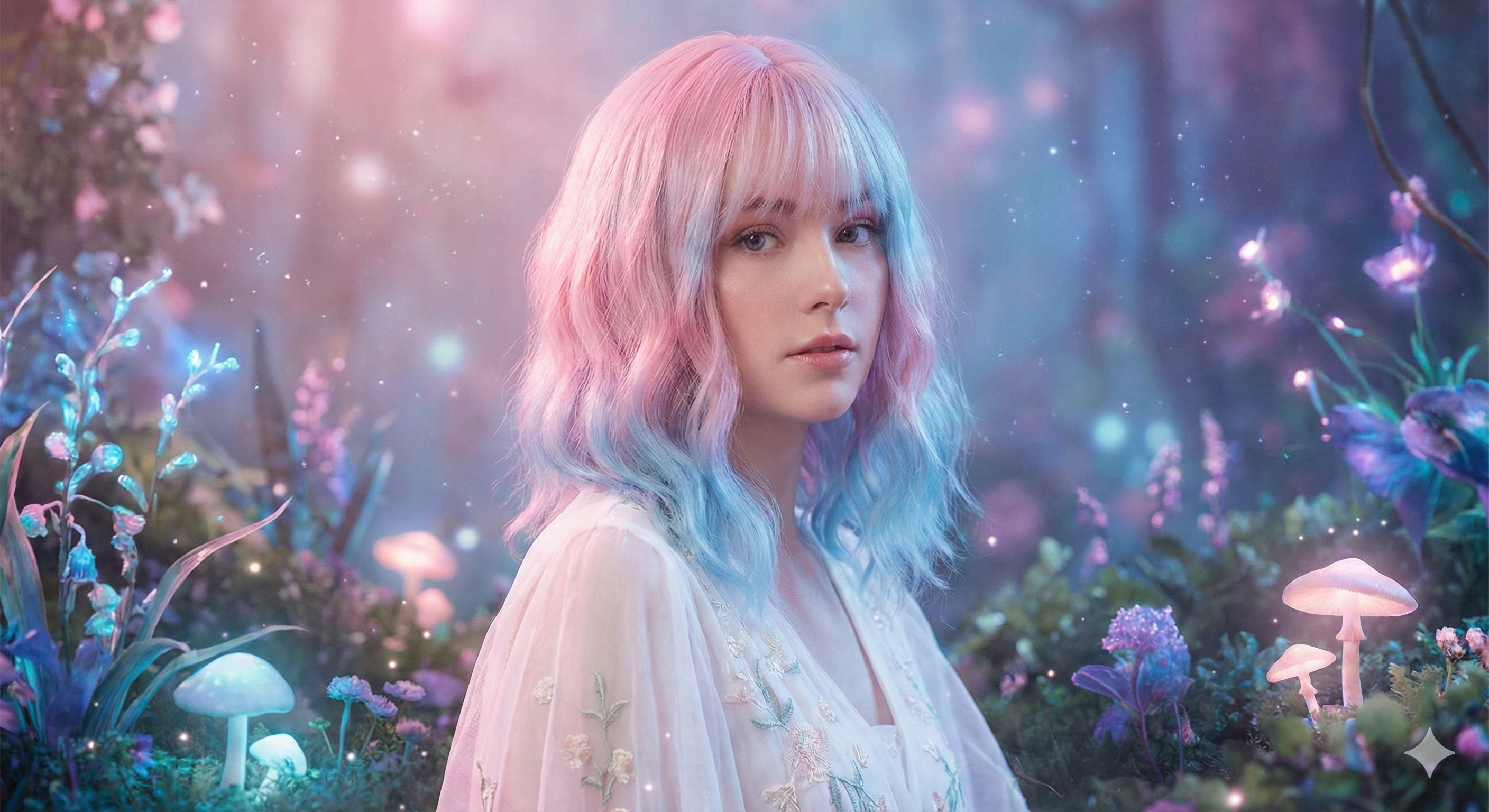 プロンプト(コピー用): Medium hair, pastel pink and blue gradient hair, soft waves, see-through bangs, airy, fantasy atmosphere, dreamy lighting.