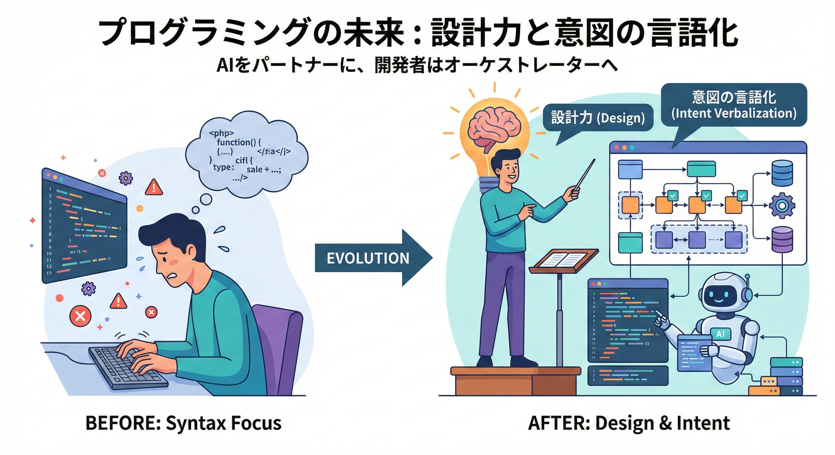 AIがコードの大部分を生成できるようになると、一言一句間違えずにコードを書くスキルよりも、「何を作りたいか」「どういう構造にすべきか」という設計力(アーキテクチャ)が重要になります。