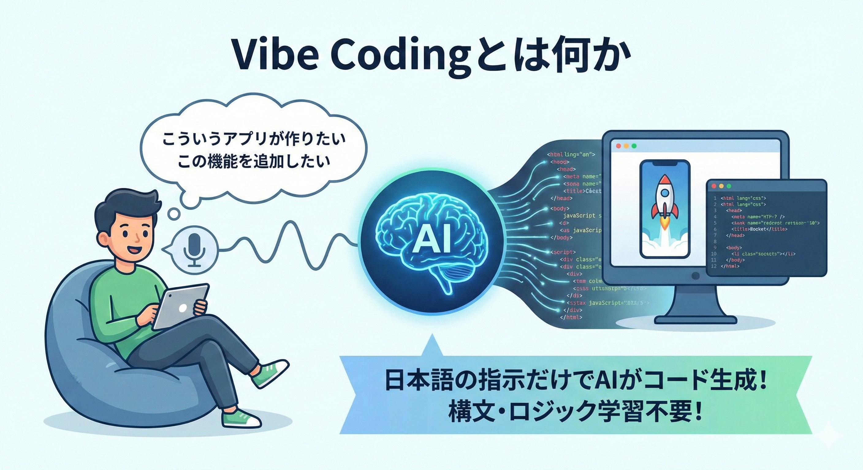 Vibe Codingとは、AIに自然言語で指示を出すことでコードを生成する開発手法です。従来のプログラミングのように、構文やロジックを一から学ぶ必要がありません。